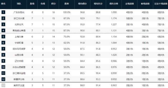 随着广东8轮全胜,广厦送北京首败,CBA最新积分榜有变:榜首易主