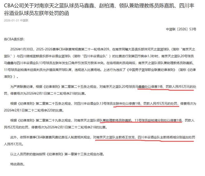 CBA两份罚单!南京四川4人禁赛,罚款16万,刘维伟不在意5连败