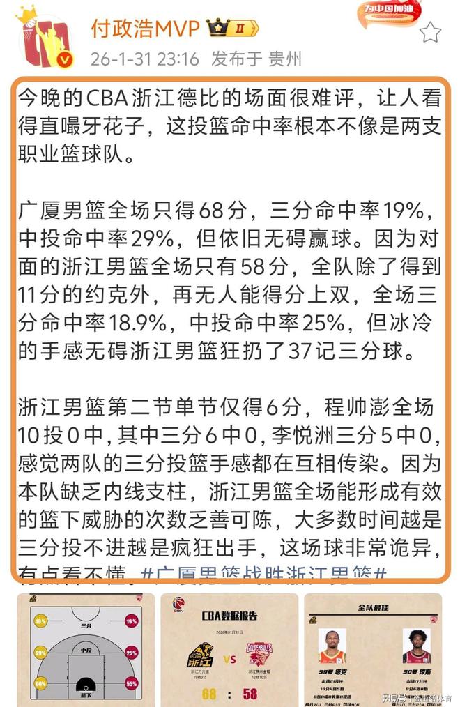 赛后,连著名体育记者付政浩也忍不住在社媒发文吐槽“今晚的CBA浙江德比的场面很难评,让人看得直嘬牙花子,这投篮命中率根本不像是两支职业篮球队。广厦男篮全场只得68分,三分命中率19%,中投命中率29%,但依旧无碍赢球。因为对面的浙江男篮全场只有58分,全队除了得到11分的约克外,再无人能得分上双,全场三分命中率18.9%,中投命中率25%,但冰冷的手感无碍浙江男篮狂扔了37记三分球……”。
