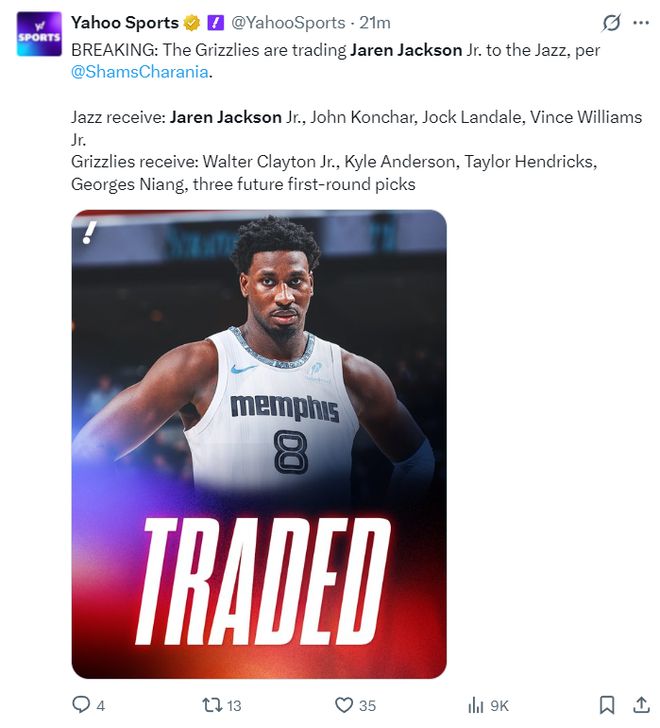 北京时间2月4日凌晨,根据ESPN记者Shams的报道,爵士队与灰熊队达成交易,小贾伦-杰克逊将被交易到爵士队换取三个首轮签。