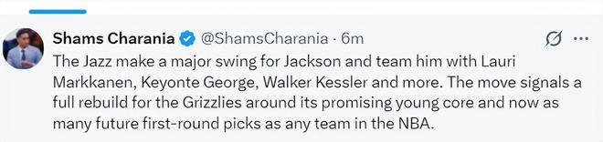 Shams的跟踪报道是,爵士队在这笔交易后表示,球队将与小贾伦-杰克逊、马尔卡宁、乔治、凯斯勒等球员一同视为未来一部分。这一举措表明爵士队将围绕这套极具潜力的年轻核心阵容进行重建,而且爵士队目前手握的未来首轮签数量也与任何一支球队相当。
