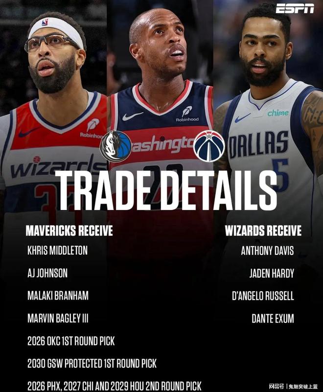双方达成的具体交易为:独行侠送出安东尼戴维斯+杰登哈迪+德安吉洛拉塞尔+丹特埃克萨姆,从奇才换回克里斯米德尔顿+AJ约翰逊+马拉凯布兰纳姆+马文巴格利+2026年首轮签(来自雷霆)+2030年受保护首轮签(来自勇士)+2026年次轮签(来自太阳)+2027年(来自公牛)+2029年次轮签(来自火箭)。