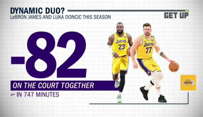 第二项数据就是东契奇和詹姆斯本赛季同场的747分钟,湖人输给对手82分,在全队任何双人组合的数据里,这是最差的。