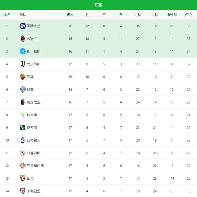 意甲战火持续升温,第17轮联赛迎来多场焦点战。AC米兰3-0完胜维罗纳、那不勒斯客场2-0击败克雷莫内塞、国际米兰1-0力克亚特兰大,多场焦点战同时落幕,意甲最新积分榜也随之出炉。争冠集团与欧战区的竞争,在这一夜再度被拉开层次。