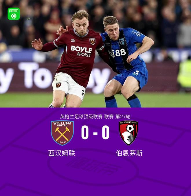 北京时间2月22日英格兰足球顶级联赛 联赛 第27轮,西汉姆联主场对阵伯恩茅斯。最终比分西汉姆联 0-0 伯恩茅斯。