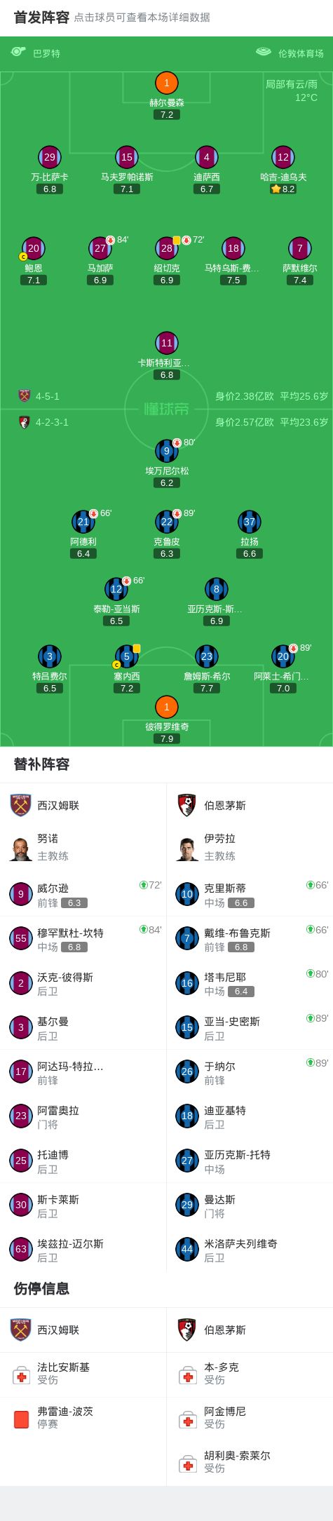 西汉姆联0-0伯恩茅斯,拉扬一条龙奔袭中框